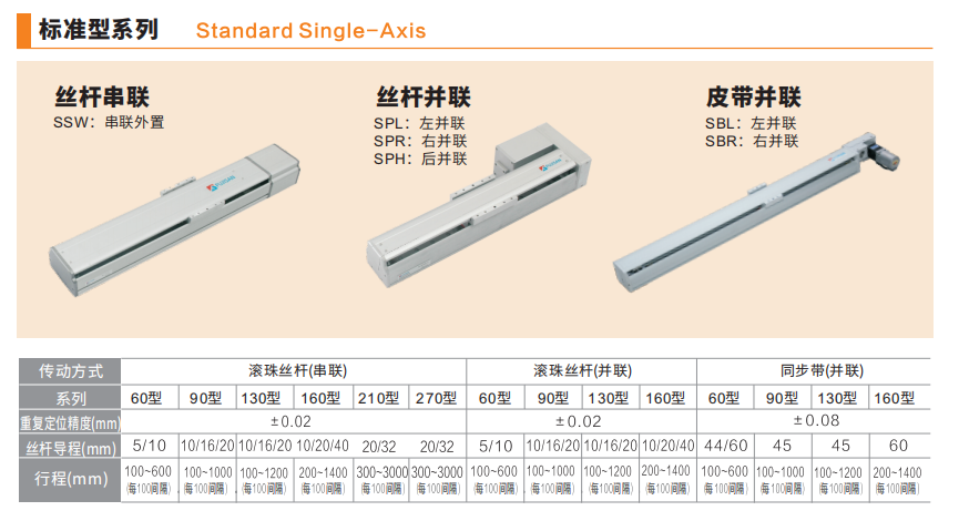 產品的多樣性,以應對各種不同使用場合我們備有應對高精度、高負載使用場合的絲桿串聯和井聯型,長行程高速搬運的皮帶型,多種不同規格可應對不同使用場合的需要。 結構類型:絲桿串聯型、絲桿并聯型、皮帶驅動型 重復定位精度為士0.02mm 重復定位精度:即機械手在同一點進行重復定位時,停止位置誤差的最大范圍值。 多種組合方式,靈活多變 利用專用連接件,可根據需要隨意將多條機械手組臺使用:兩軸直角式組合、三軸直角式組合、三軸龍門式組合 高強度、高剛性型材底座 機械手底座采用高強度擠壓鋁合金型材,為中空加強構造,表面陽極氧化處理,保證了機械手運行時的剛性。結構類型:絲桿串聯型、絲桿并聯型、皮帶驅動型聯系艾而特